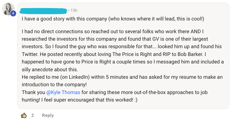 🎥 Use Video: Most people aren’t comfortable recording themselves on video. This is why if you do… you’ll stand out. I highly recommend using a product like allUP. I spoke to the founder this week, and he said he got a message from one user saying she had landed interviews at every company she sent her profile. Why does video work? It lets people see who you really are. Plus, if a photo speaks a thousand words, a video referral speaks a million. (This is not a sponsored plug, I genuinely think the product is unique and can be a job search game-changer).