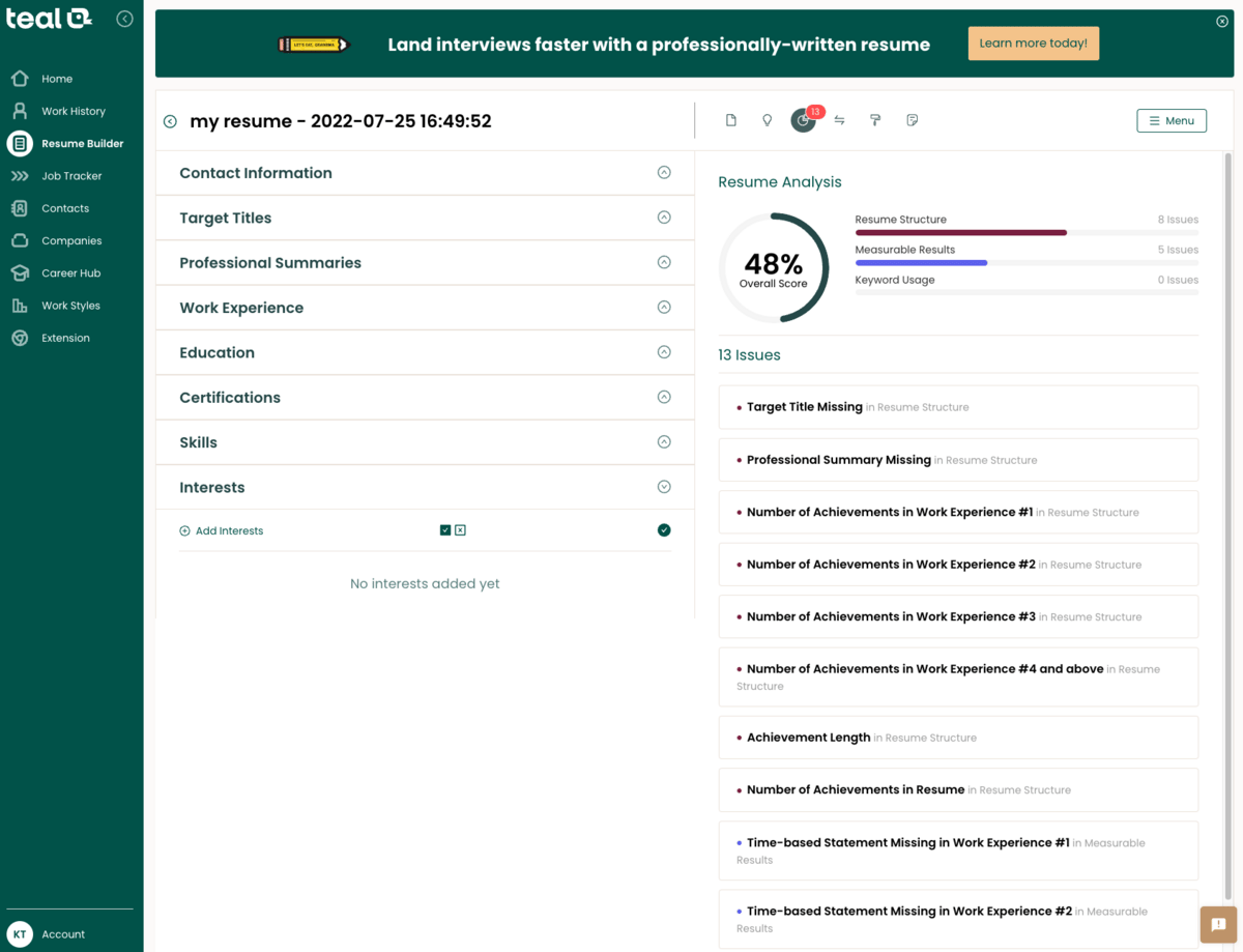 Targeted Resume: It’ll help you analyze your resume against job description keywords and tell you which ones are missing but the interface to update and add them to your resume is a bit clunky.